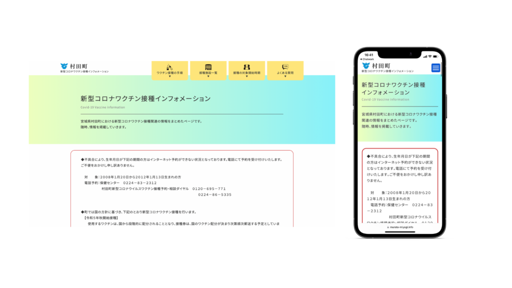 宮城県村田町の新型コロナワクチン接種予約サイトの新規制作。 Nuxt.jsにて作成したSPAです。 予約サイトと予約状況管理画面のデザイン、コーディングを担当。 https://www.murata-miyagi.info/